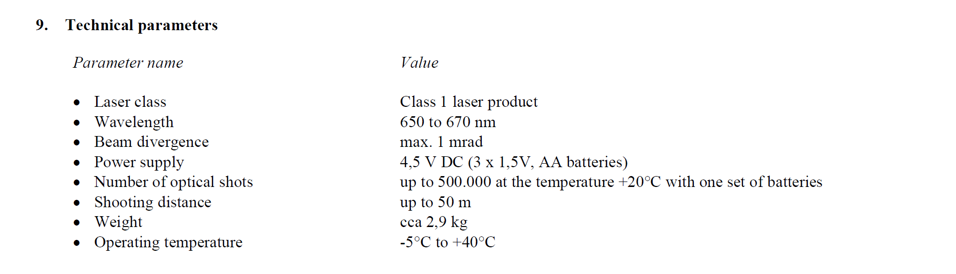 Laser Technical Parameters