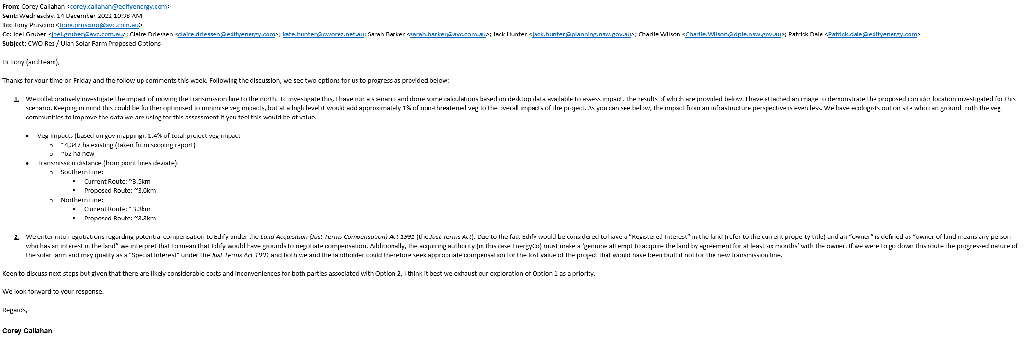 Following EnergyCo's own justification and definition of a "related development" (mail from 17th October 2023), Edify continues to seek clarification from EnergyCo as to why the Ulan Solar Farm has been omitted from the easement route plans for the 500kV CWO REZ Transmission Line.