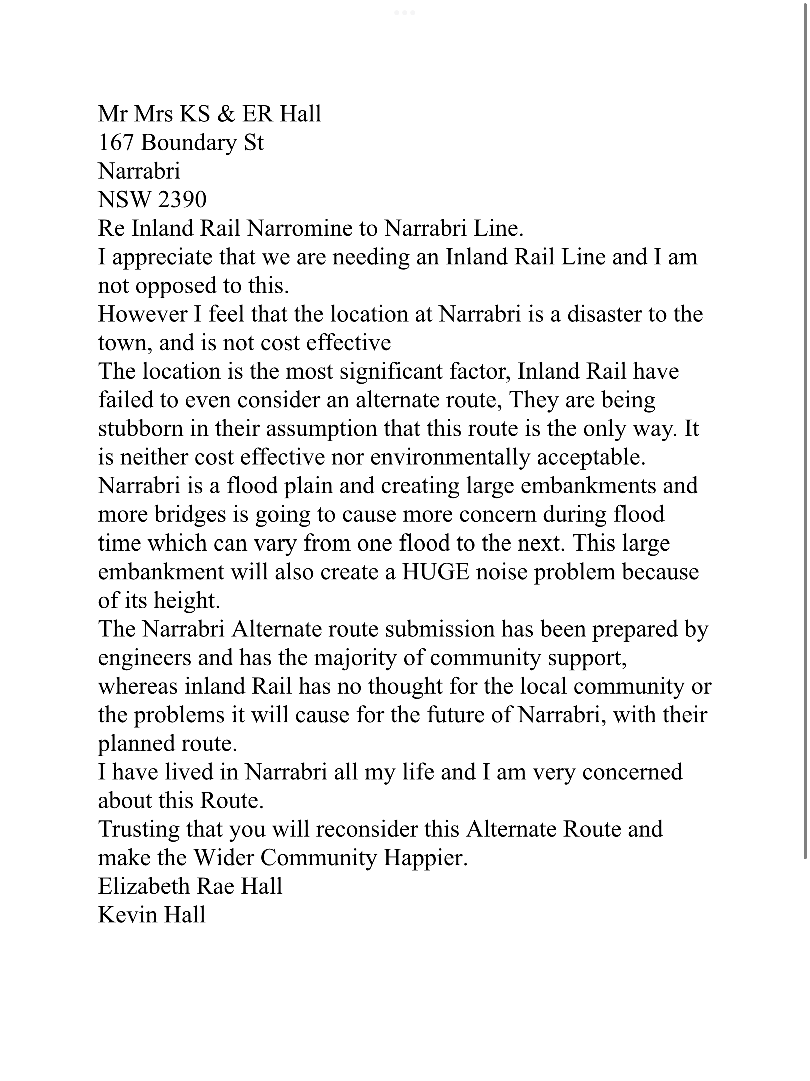 Assessment of the Narrabri Alternative Route has been endorsed and supported by our state member, Roy Butler; Narrabri Shire Council (repeatedly); Narrabri Chamber of Commerce; the Narrabri Branch of the National Party; the Narrabri Inland Rail Concerned Residents Group and MANY MANY effected home owners, like me, in Narrabri. Please make IR listen AND assess the Narrabri Alternative Route.