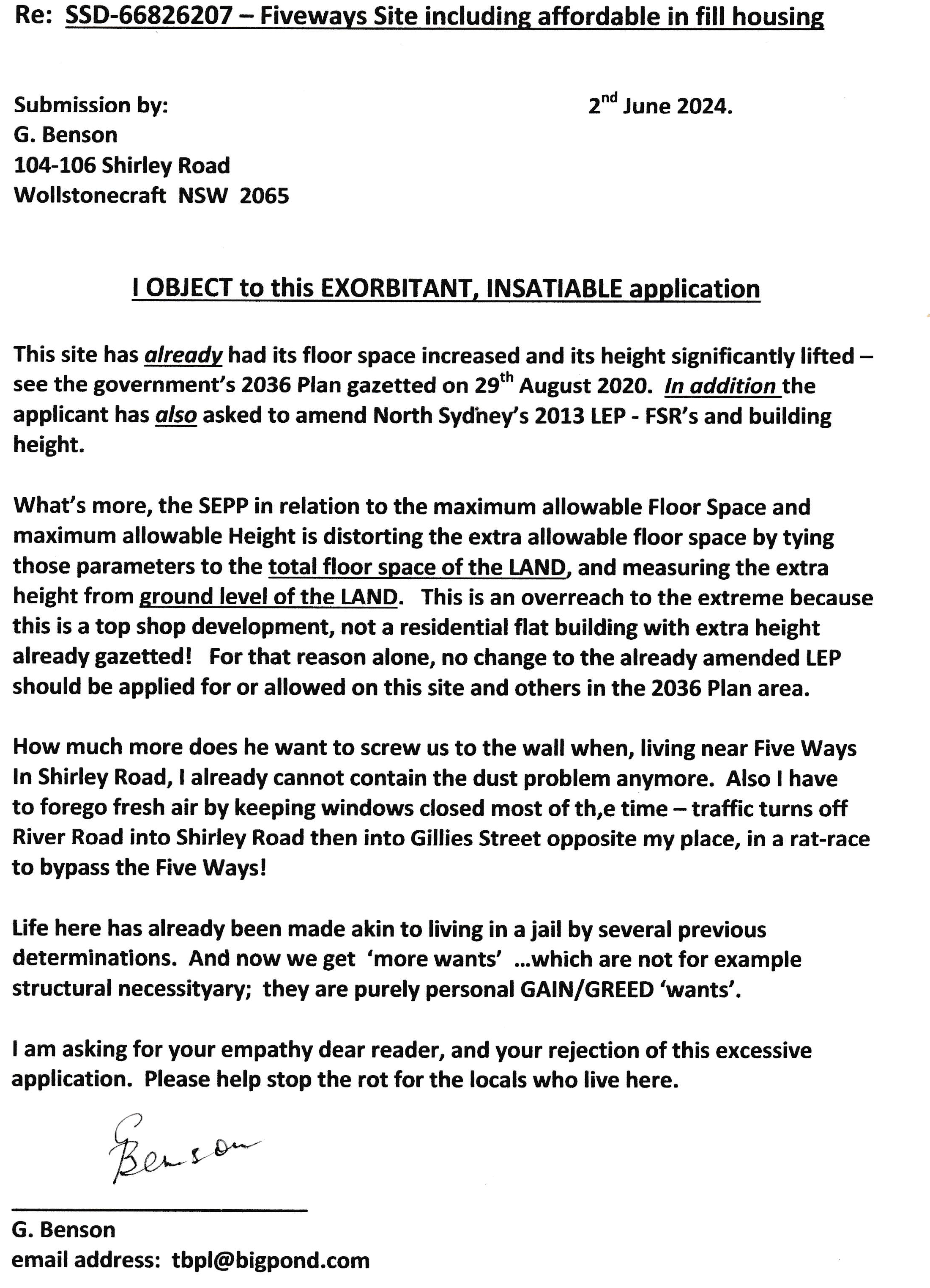 I OBJECT to the lack of contribution to Open Space in Crows Nest.