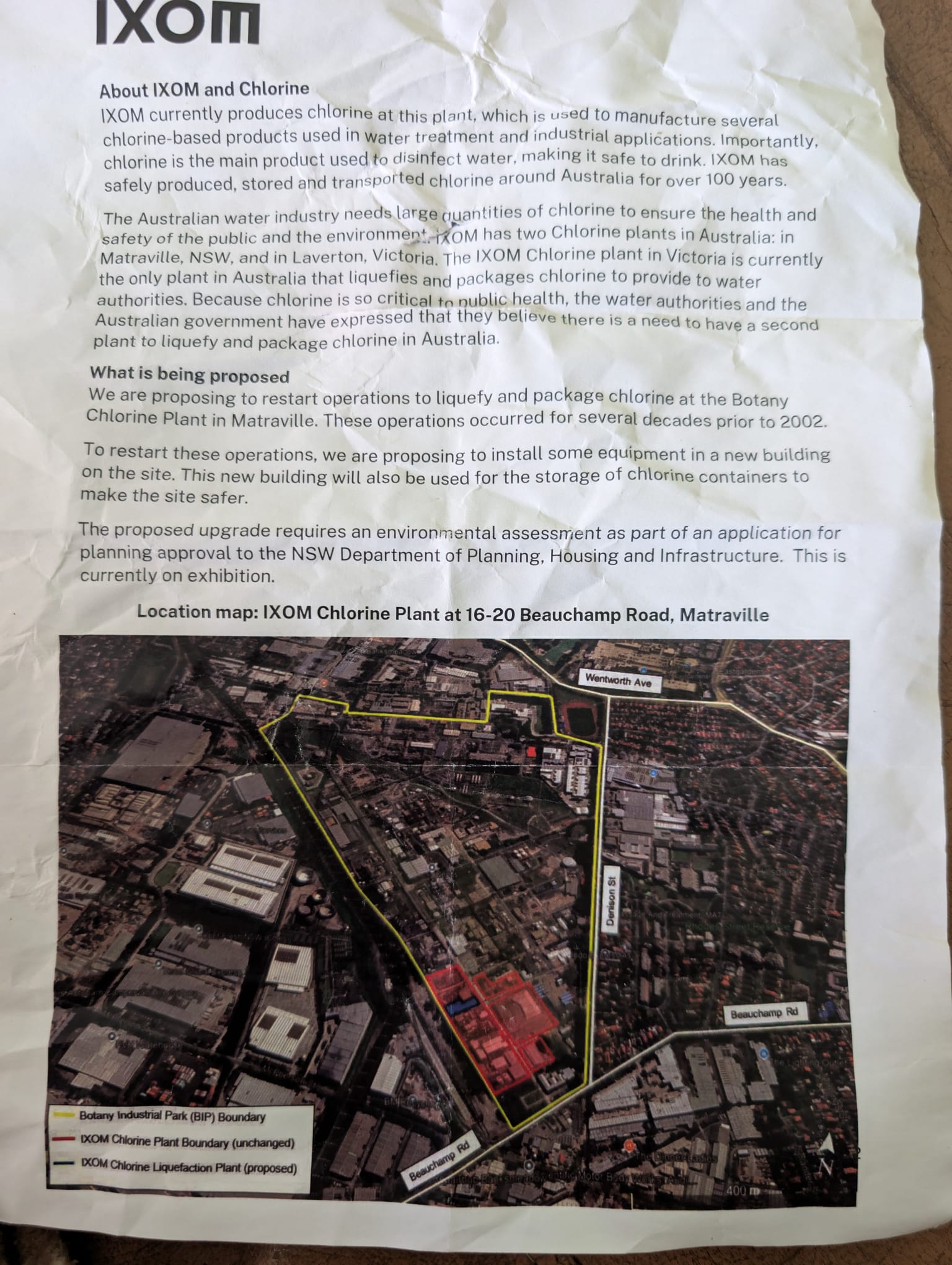 The application to upgrade the IXOM Chlorine Plant at 16-20 Beauchamp Road, Matraville has been dressed up to hoodwink local residents. I attach a copy of the letter circulated to residents regarding the application designed to placate and deceive residents into failing to identify the clear danger of the proposed application.