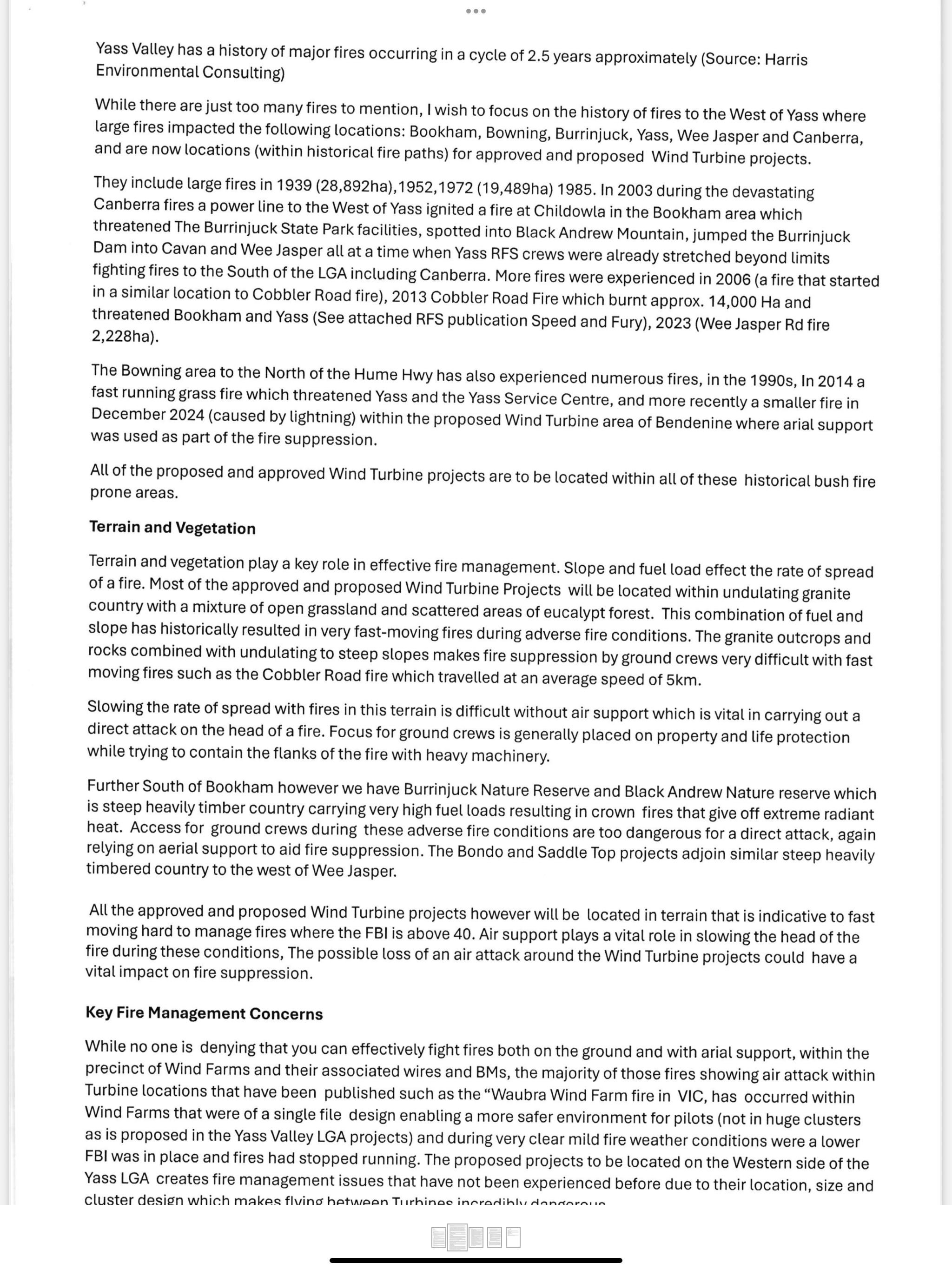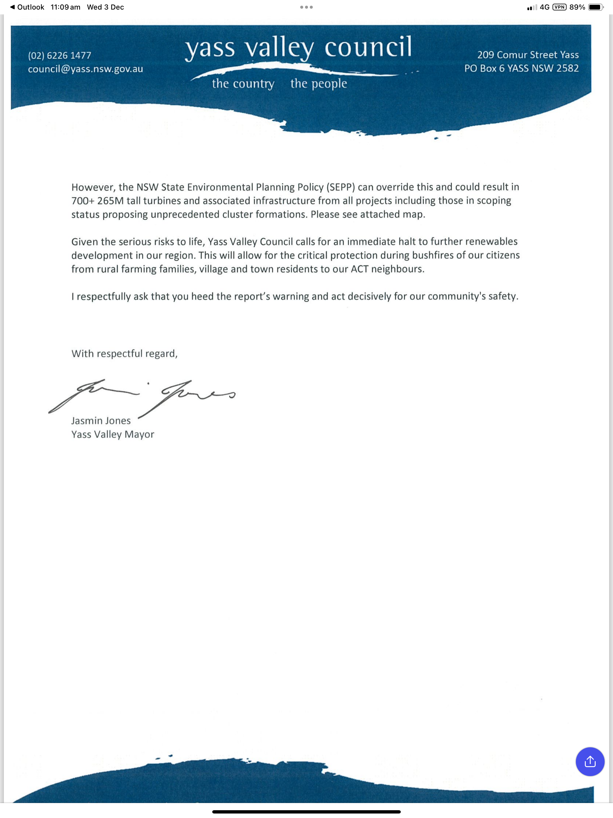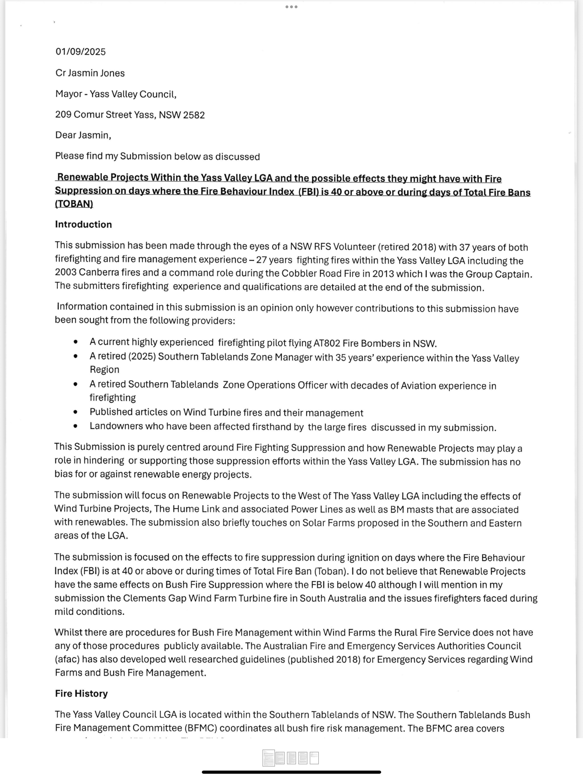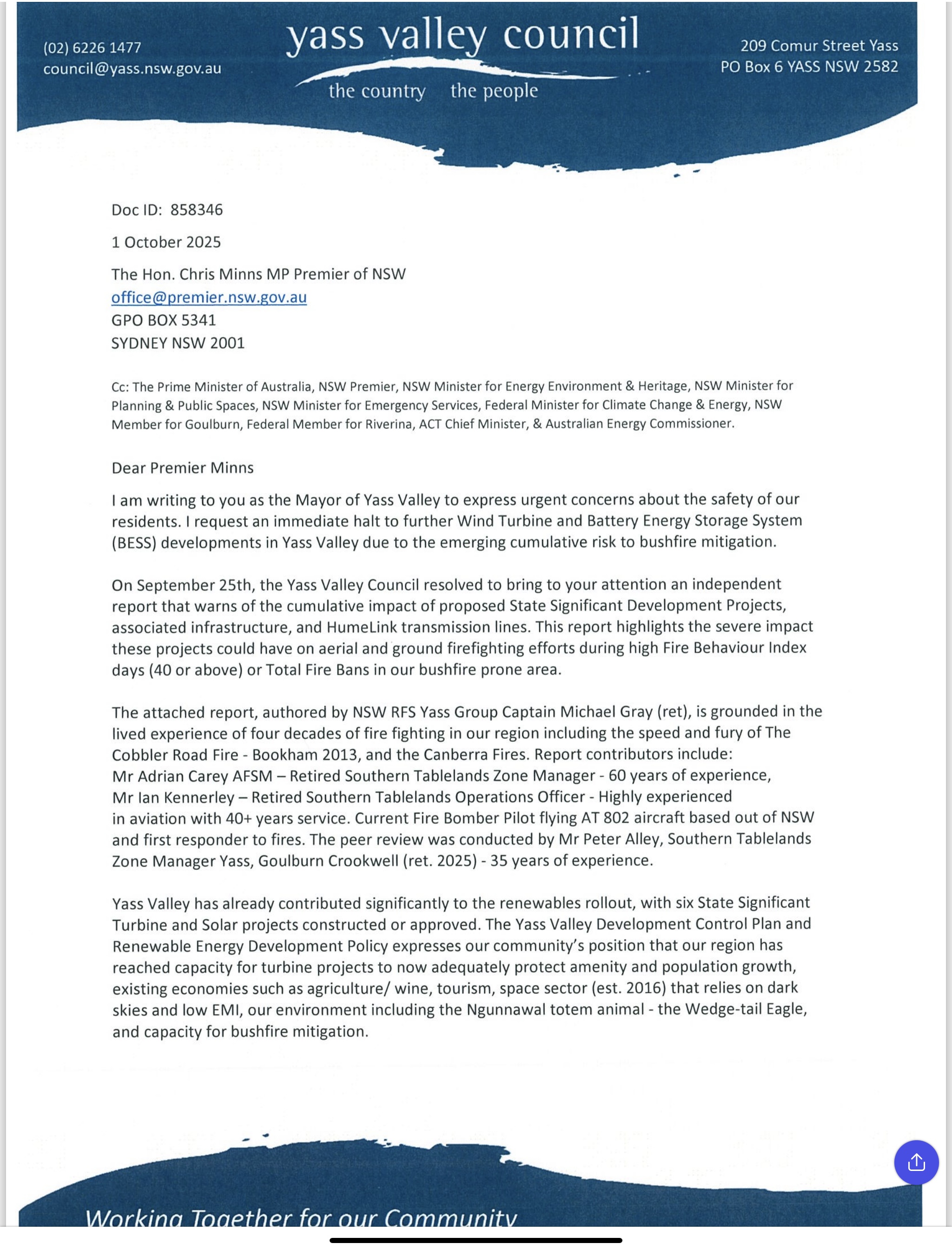 Yass Valley Council has appealed to the Premier, the Minister and the Prime Minister requesting an immediate halt to further Wind Turbine and Battery Energy Storage System (BESS) developments in Yass Valley due to the emerging cumulative risk they pose to bushfire mitigation.