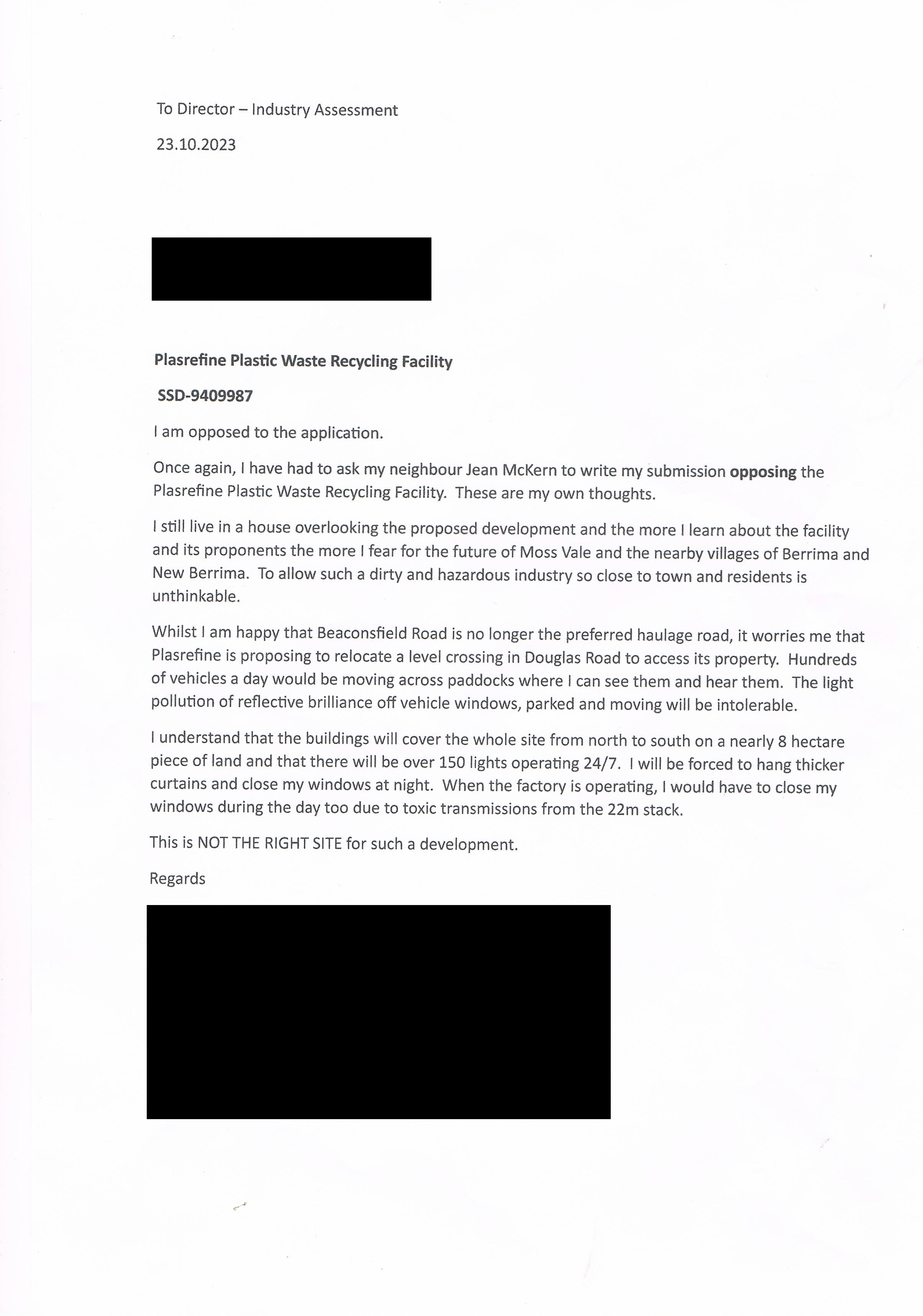 I am making a submission in opposition to the above mentioned State Significant Development by Plasrefine Recycling Pty Ltd.