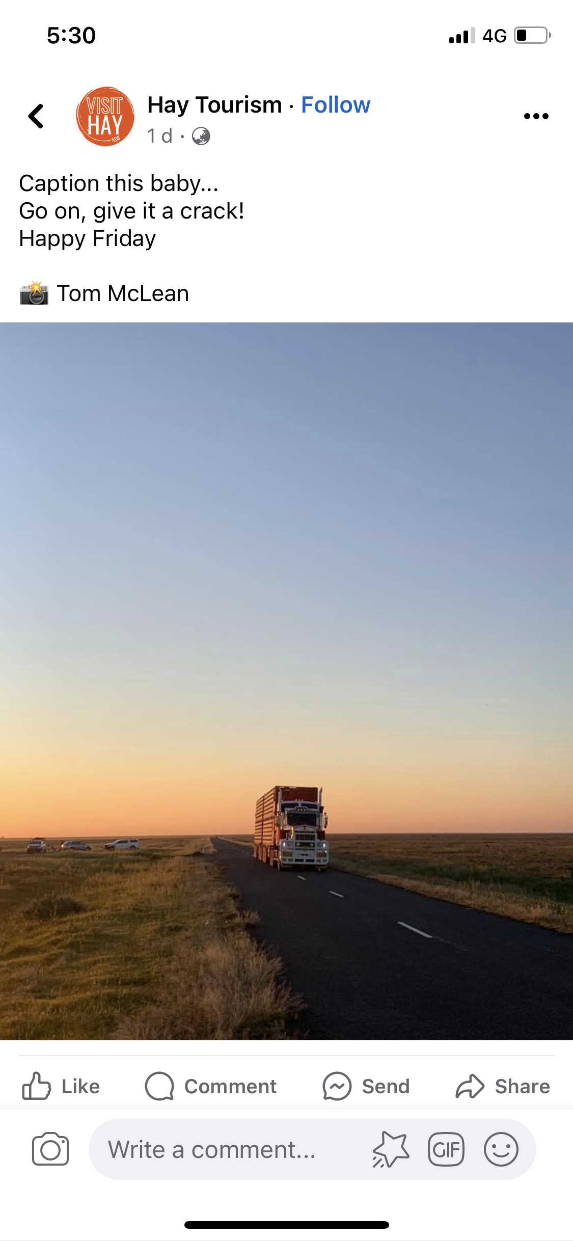 I've attached a photo which was recently posted on the Hay Tourism Social Media page taken on the Cobb Highway and got 100's of replies, the common theme was the endless Plains. Some of the replies where, "Nothing comes close to the Hay Plains", "There is nowhere in the world like the Hay Plains", "Long endless horizons orange haze makes for endless days, follow the sun it leads to Hay".