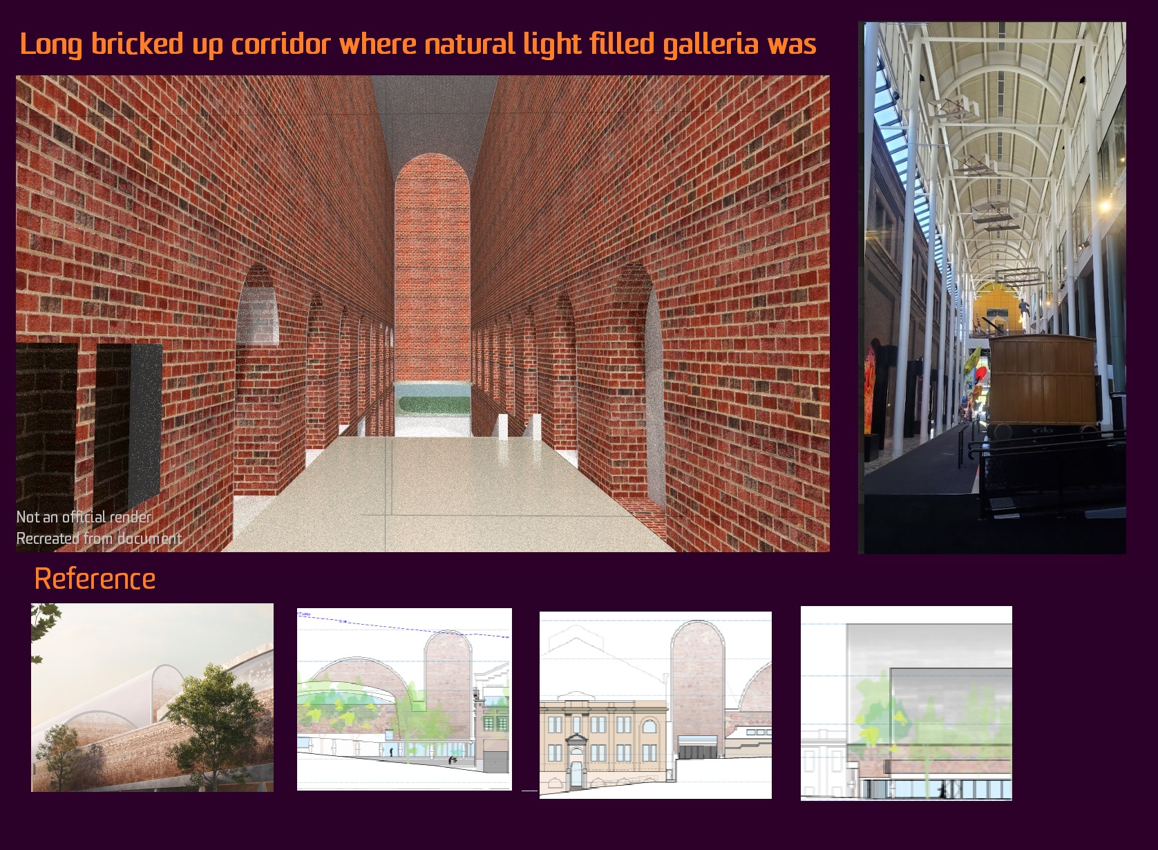 Not a single detail of this beloved museum is going to survive, should this renovation go forward. The restored engine room, the mezzanines designed to echo the decks of the original power plant, none of the murals, train station like galleria arches, any of the remaining postmodernist detail or form - all being demolished. This proposal is an even further erosion of the character of this once beloved building. And yet they still have the gall to call it a "heritage restoration". It's like they never even studied the original museum.