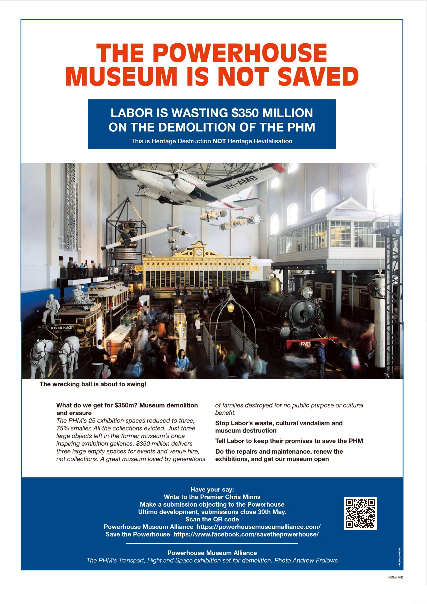 Plans to renovate and improve the Powerhouse are a good start, but it should not come at the cost of significantly downsizing the Powerhouse’s exhibition space and displayed collection. The argument that ‘management of the museum’s collection is not a planning matter’ should be invalid if museum management uses planning applications to demolish more than half of its existing exhibition space. The proposed plans would be fine for a new museum, but the problem is that this is for the Powerhouse. If plans remain unchanged, the Powerhouse’s external fabric may be ‘revitalised’, but its function as a museum will be greatly diminished.