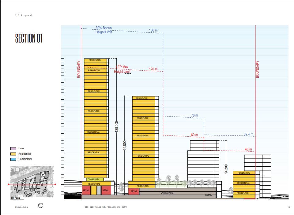 The Wollongong Local Environmental Plan (LEP) 2009 – Height of Building Map identifies a maximum building height of 48 metres for this area.