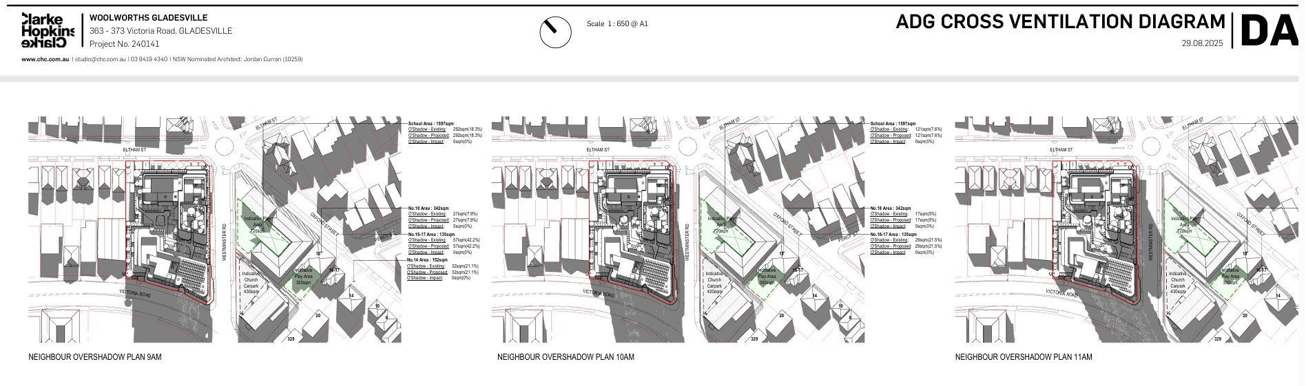 The proposal plans do not clearly demonstrate the potential for overshadowing further along the southern side of Victoria Rd, for starters. The diagrams fail to show the potential for overshadowing by a 14 storey building in its completeness. A significant region not shown in the diagrams will clearly be affected. When extrapolated, the full extent is clearly excessive.